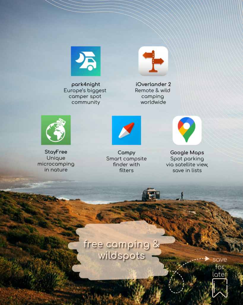 ✔️ Park4Night – The go-to community-driven app for finding free camper parking places and wild spots across Europe, with user reviews and photos to help choose the right place (best for spontaneous overnight and service spots).