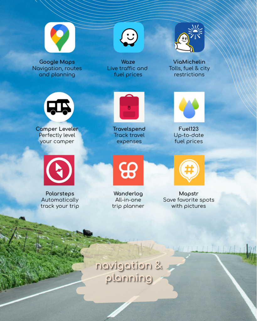 ✔️ Via Michelin – A trip planner that shows toll costs, fuel usage estimates and restricted zones — ideal for long routes with a camper.